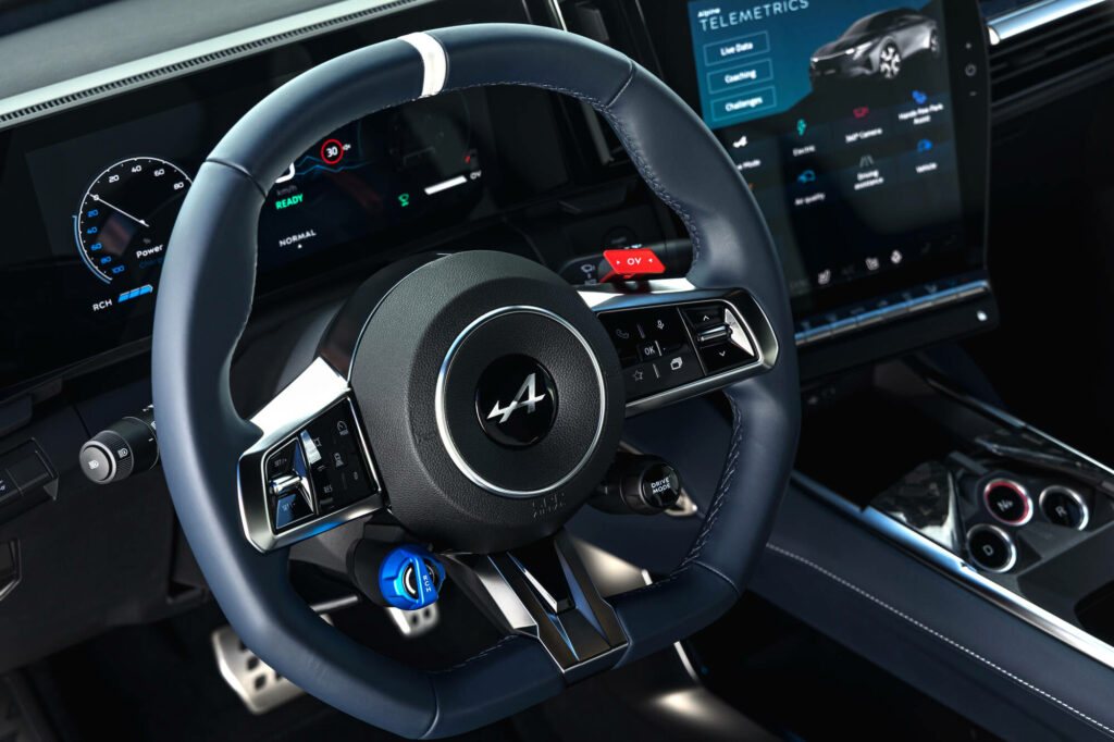 Une fonction Overtake commandée au volant depuis un bouton physique de couleur rouge (nommé OV) délivre un surcroît de puissance le temps de l’appui, et jusqu’à une durée de 10 secondes. Cette fonction, issue du sport automobile et du monde du gaming, a fait l’objet d’un dépôt de brevet. Lors de la délivrance de ce surcroît d’énergie, l’écran d’instrumentation affiche une animation symbolisant la vitesse et une visualisation de la réserve de temps restant, tandis qu’une animation dynamique apparaît dans l’écran central d’Alpine Telemetrics.