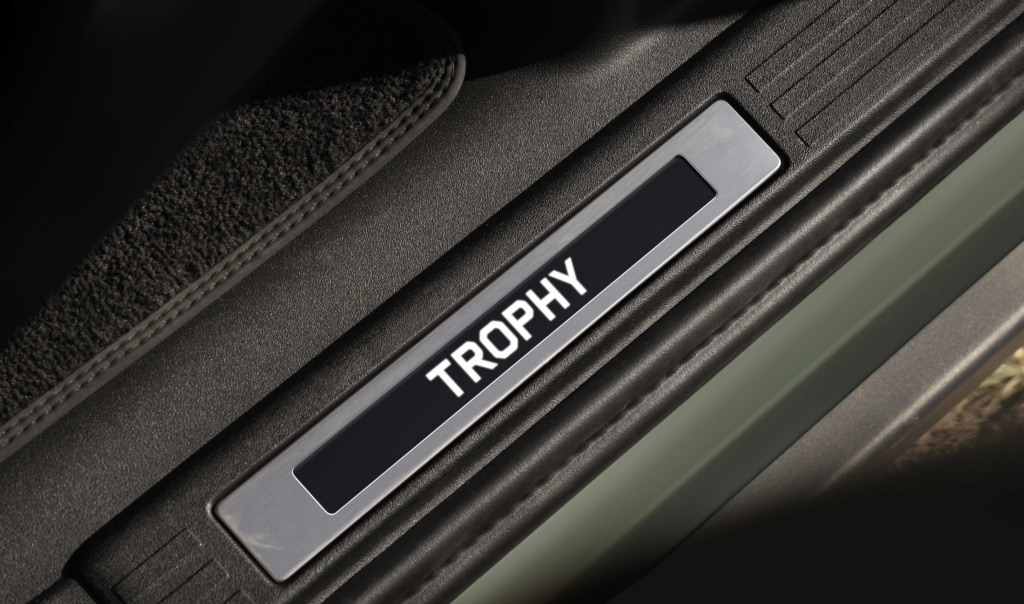 Disponible exclusivement en Deep Sandglow Yellow ou Keswick Green, le Trophy Edition se distingue par des finitions contrastées Gloss Black sur le capot, le bas de caisse, les étriers de frein et les crochets de remorquage arrière.